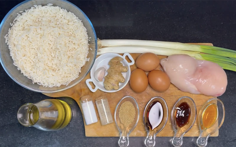 Añadir el pollo, el huevo, el aceite de sésamo y la parte verde de la cebolleta. - Finalizar:
